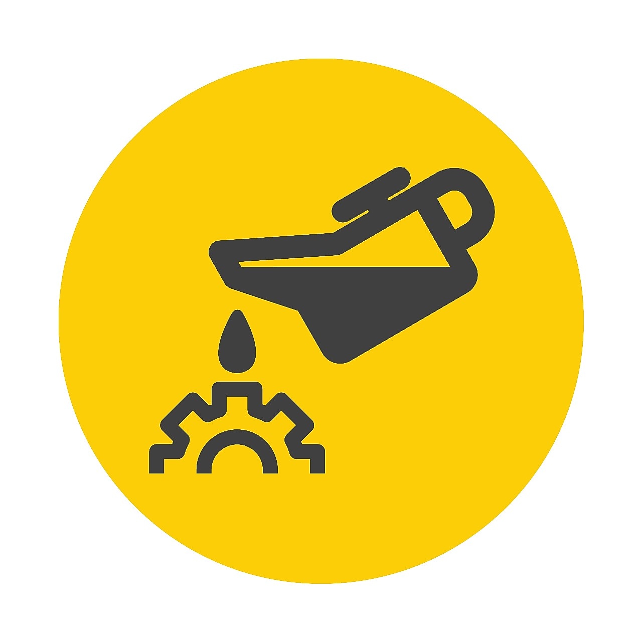 A yellow droplet descends from the top to the middle of the screen, transforming into a spinning roundel. This roundel includes animations of an orange robotic arm, a white spinning wind turbine, an open gear and a grey spinning cog. There are small animations of lubricants moving and arrows around the focal roundel.