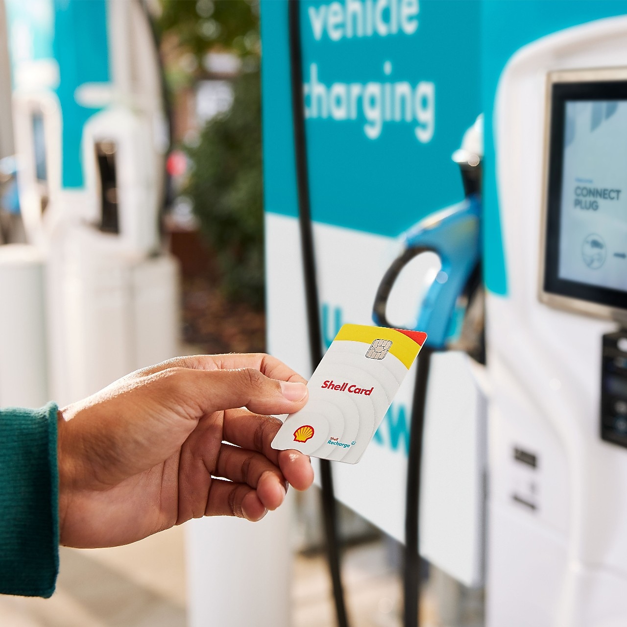 A man closes the van’s side door, plugs a charger into the van, and swipes a Shell Card at a Shell Recharge station. The van is shown beginning to pull out of the station.
