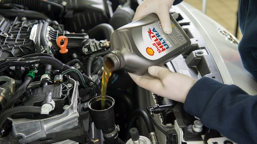 A container of Shell Helix Ultra engine oil, suspended above the car’s open bonnet, pours its